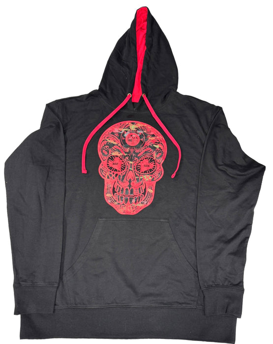 Lightweight hoodie, red hood, kangaroo pocket. Sized the same as our t shirts
