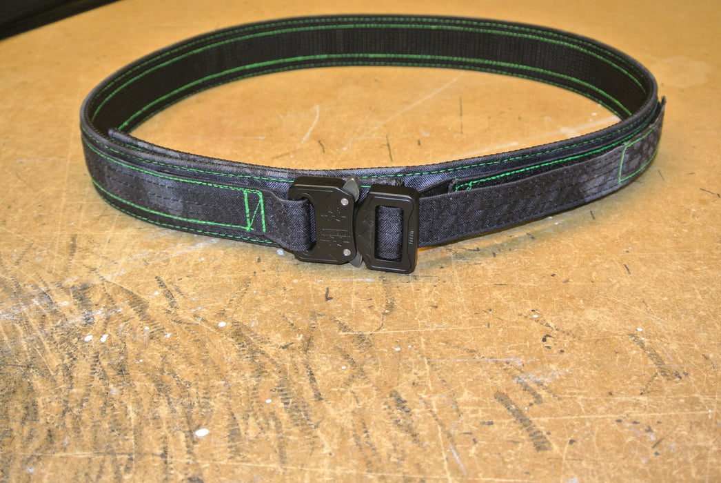 Fully wrapped camo EDC belt. Rather than using poor quality, poor looking printed webbing to achieve a fully camo belt we use cordura to wrap the entire belt and make the webbing. This takes a lot more labor and a lot of skill but make for a much better product.