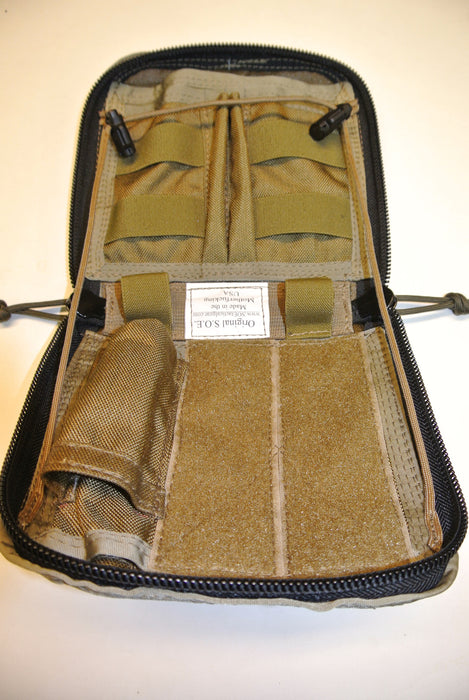 Sizing: Approximinately 7"Tx7"L. Carries a variety of operational gear including documents, lights, and small electronics.