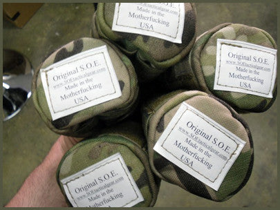 This Beer Coozie includes padded insulation. PALS on the outside to attach to gear and just look badass covering your beer or soda can. Velcro to attach you favorite SOE patch. Tilt it up and show the "made in the MotherFucking USA" tag.