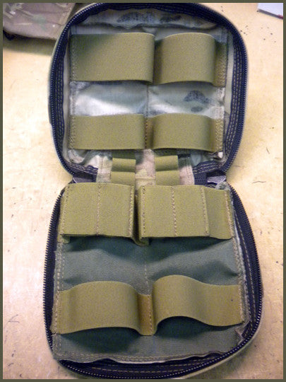 Chem light loops to Illuminate work area. Bungees on bottom to hold TQ's under pouch.
