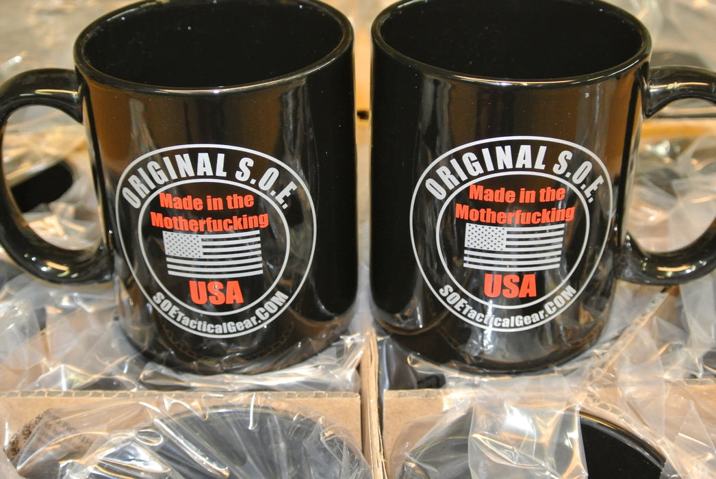 Drink your caffeinated (or decaf) beverages in Original S.O.E. style with our S.O.E. MITMFUSA logo coffee mug.