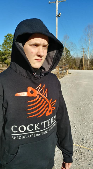 Black Hoodie with gray liner in hood.  Super soft feel. Design is in Red and metallic silver ink. Has small pocket for change, hand cuff key, hundred dolla bills, etc.