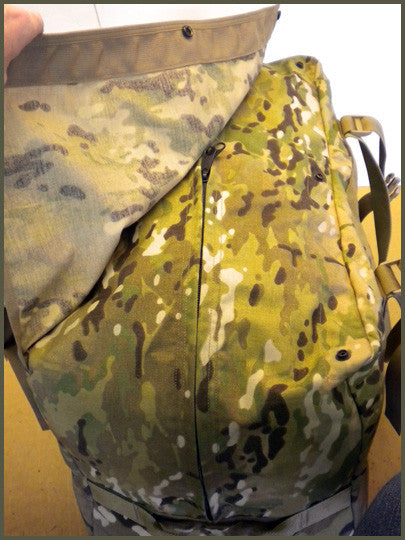 Type 7 webbing handle fully cradles around the entire bag as well as both ends. Flap snaps closed over zipper